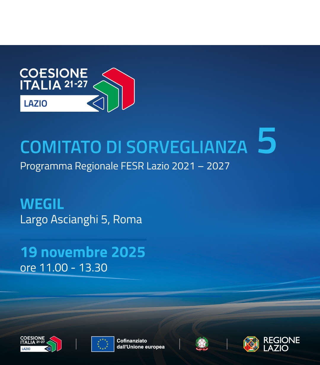 Il 19 novembre si terrà la quinta seduta del Comitato di Sorveglianza del PR FESR Lazio 2021-2027, che rappresenta un importante momento di confronto tra la Commissione europea, gli stakeholder e tutti gli attori che a vario titolo sono coinvolti nel Programma.