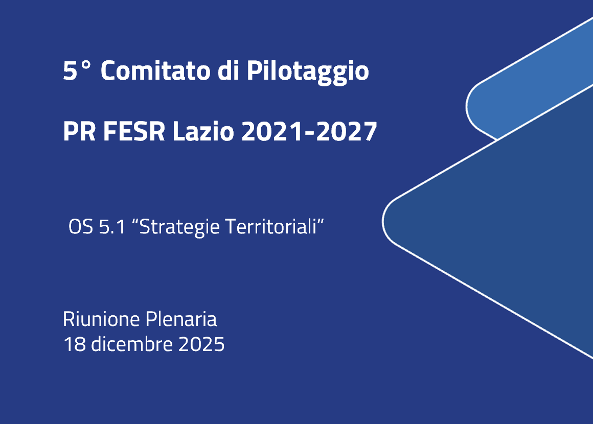 Si è svolto il 18 dicembre la 5ª riunione del Comitato di Pilotaggio delle Strategie Territoriali, l’organo di coordinamento composto dall’Autorità di Gestione del Programma e dai Comuni capoluoghi di provincia responsabili delle Strategie Territoriali e beneficiari delle risorse dell’Obiettivo di Policy n. 5 del PR Lazio FESR 2021-2027.