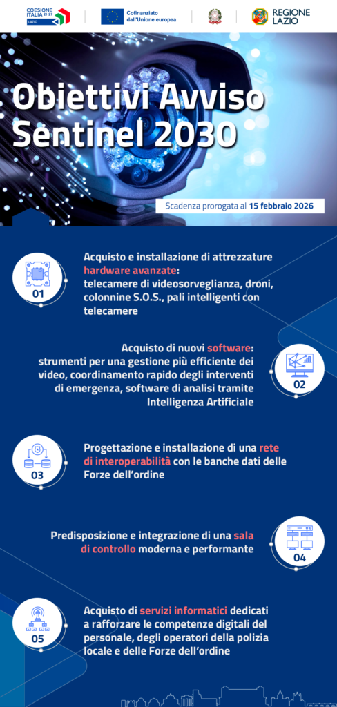 Le risorse si aggiungono a quelle già stanziate agli stessi Comuni per sostenere Strategie Territoriali e i Piani di riqualificazione urbana, favorendo progetti di modernizzazione e sicurezza. Lazio Sentinel 2030 consentirà di finanziare servizi innovativi come sistemi di videosorveglianza avanzata, sensoristica, analisi dati e intelligenza artificiale di ultima generazione. Inoltre, saranno installate le colonnine SOS, strumenti fondamentali per permettere ai cittadini di inviare richieste di aiuto in modo rapido e sicuro, contribuendo a elevare il livello di sicurezza, migliorare il presidio del territorio e introdurre efficaci fattori di deterrenza contro fenomeni criminali.