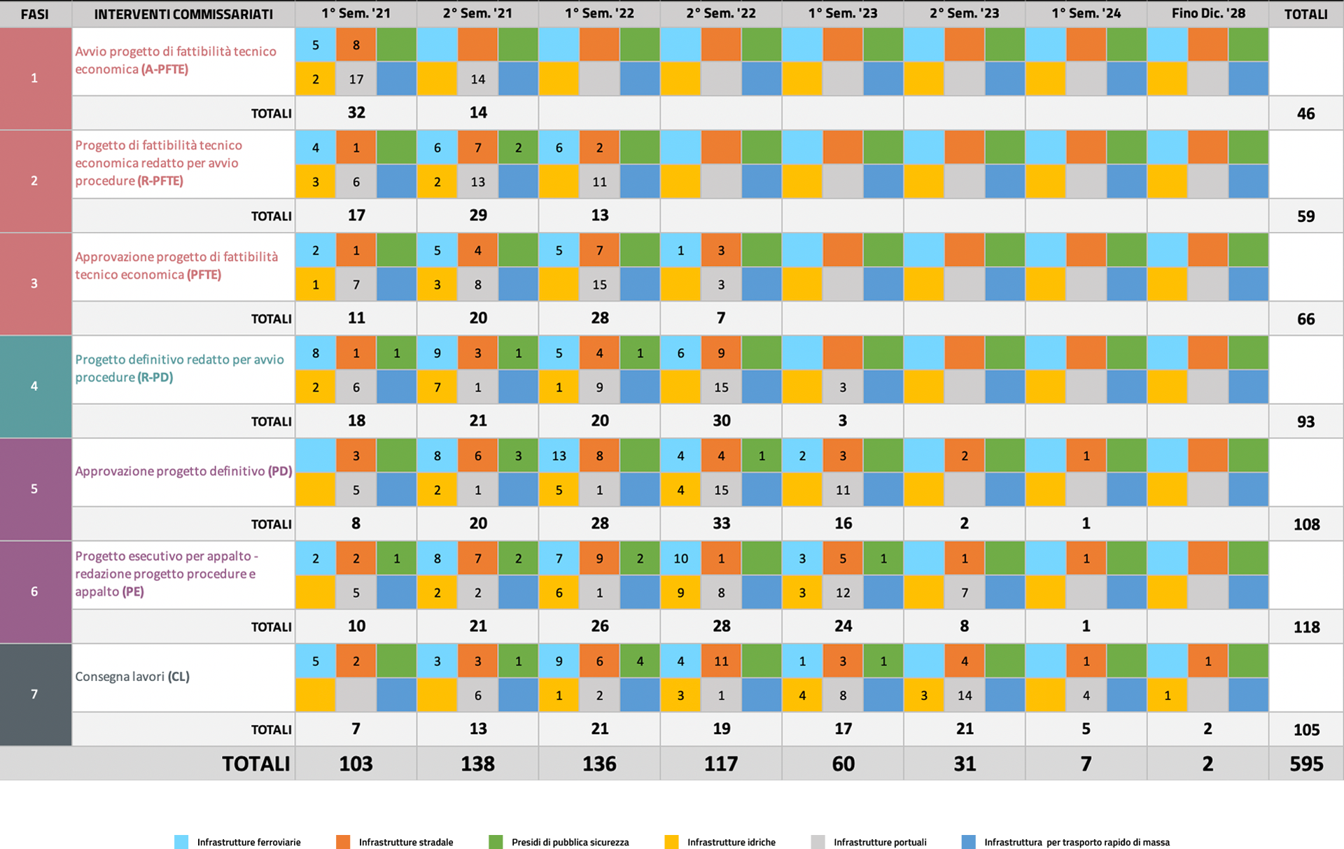 Tabella riassuntiva di previsione per fasi e per trimestri, del numero degli interventi per ciascun settore infrastrutturale.