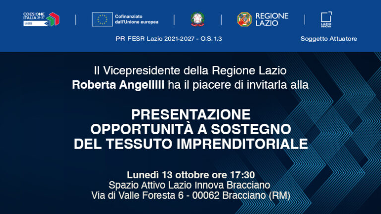 ![]() Il Vicepresidente della Regione Lazio Roberta Angelilli ha il piacere di invitarla alla presentazione delle opportunità a sostegno del tessuto imprenditoriale. Appuntamento lunedì 13 ottobre alle ore 17:30 ... |